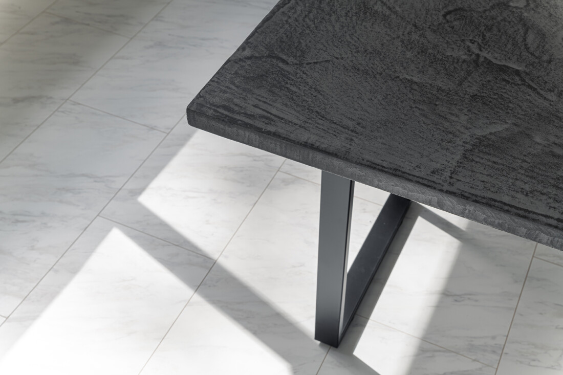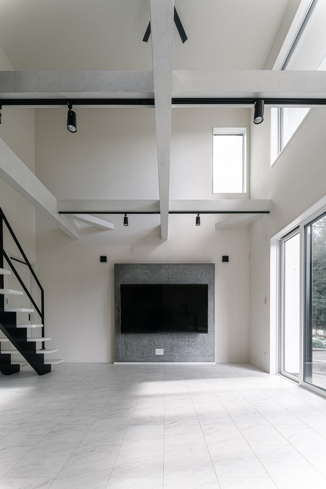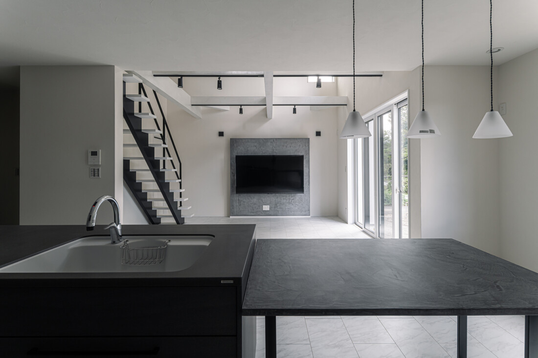他にもモールテックスで仕上げた場所が、テレビ裏の壁、キッチン背面収納、テーブル、構造で見える梁、そしてオープン階段にも使用しています。