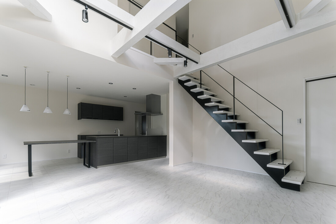 玄関を入ると室内は仕切りを極力設けない大きなワンルームのような回遊型の間取り。