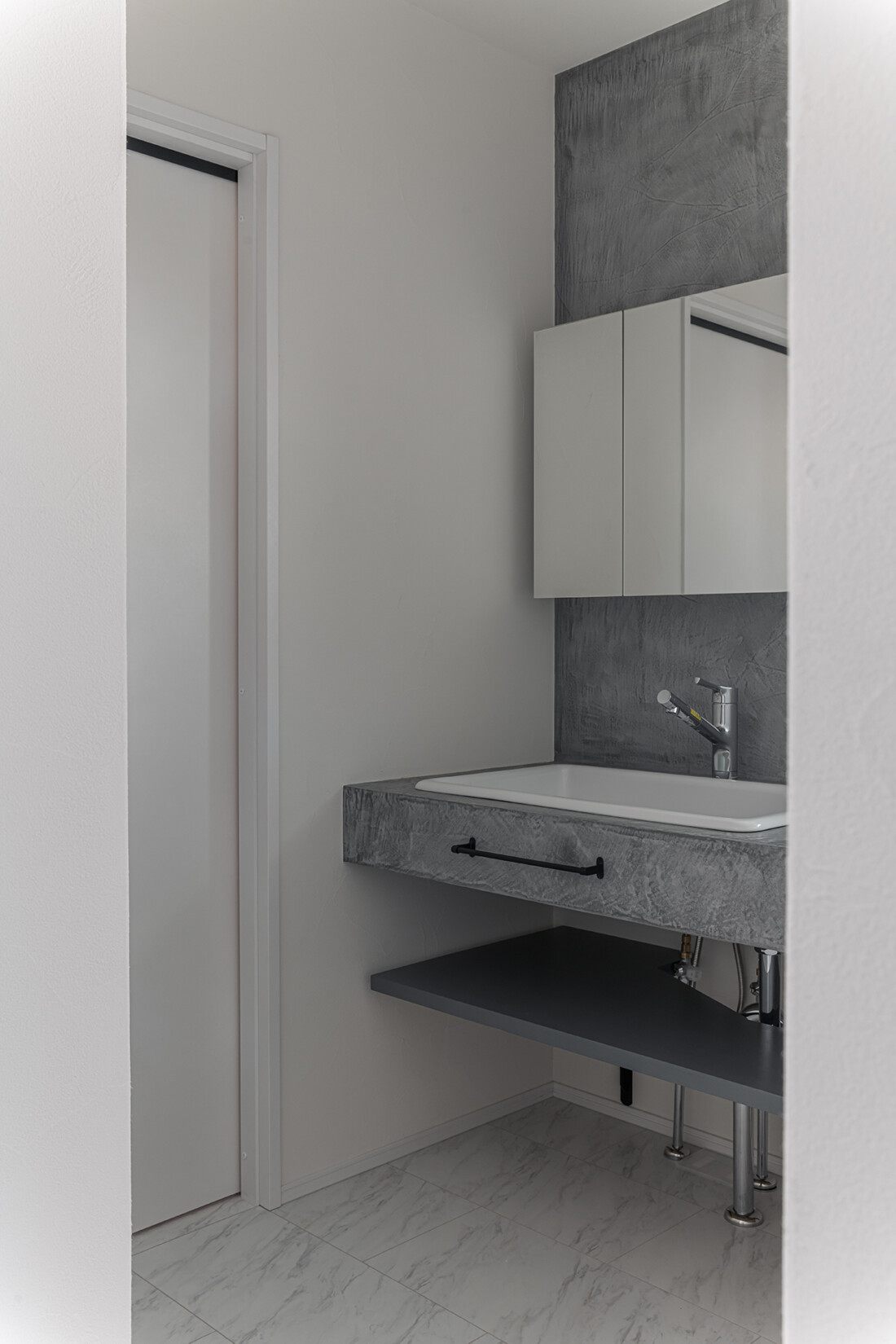 独立型の造作洗面台は深さ20㎝もある大型の病院用シンクを採用。天板や壁にはモールテックスを塗り仕上げています。